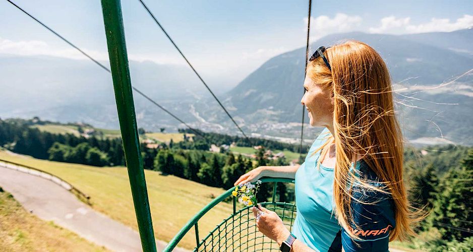 Ist definitiv eine der außergewöhnlichsten Aufstiegsanlagen in ganz Südtirol. Der grüne Korblift erinnert vom Aussehen, wohl eher an einen Einkaufswagen. Weit gefehlt, hier werden keine Lebensmittel transportiert, sondern vielmehr du und ich... ;-) In den kleinen grünen Gondeln kann man nämlich bequem zu zweit hintereinander stehen (oder mit Kind auch zu dritt), und schwebt dann langsam über Wiesen, durch ein Waldstück hinauf zur Leiter Alm. Ein einmaliges Erlebnis, das man auf keinen Fall verpassen sollte!