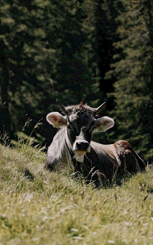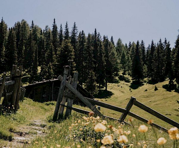 Abstieg: Für die Rückkehr folgt man unterhalb der Alm den Weg Nr. 3 in nordöstlicher Richtung durch ein kurzes Waldstück zu einer großen Almwiese mit zwei Holzhütten (Kitz Bichl). Hier hält man sich links abwärts zur unbewirtschafteten Kuntner Alm (1820m). An dieser vorbei geradeaus abwärts zum Waldrand. Einmal einen Fahrweg überquerend, durch Wald abwärts, bei einem großen Felsblock beim Hinweisschild Ulfas Alm links und hinab zu einer Forststraße. Wenige Meter entlang dieser links aufwärts und sofort wieder rechts am Steiglein weiter abwärts. Über eine mit Geländer versicherte Felsstufe links abwärts und bei der folgenden Steigteilung rechts abwärts zum Waalweg. Links am Waal entlang zurück Richtung Ulfaser Alm, wo man etwas unterhalb der Alm herauskommt. Entweder noch kurz zur Alm oder vor dem Zaun rechts am Abkürzungsweg hinab zum Fahrweg und zurück zum Parkplatz.