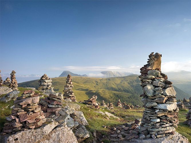 Route: From the car park (approx. 1400 m) follow trail E5 (sign: Möltner Kaser) for a short distance along the tarmac road, then on a narrow path through the forest up to the glowing larch meadows of the Möltner Joch. We reach a forest path, hike past the weather cross of the Möltener Joch (1733 m) and soon reach the Möltener Kaser hut (1763 m). Now we walk up through the forest to the broad crest of the Hohe Reisch and up a moderate incline to the countless Stoanernen Mandln (2003 m). We enjoy a panoramic rest with views of the Dolomites, the Sarner mountains, the Ortler group and the Texel group. Then we take the ascent path back to Schermoos and the car park.